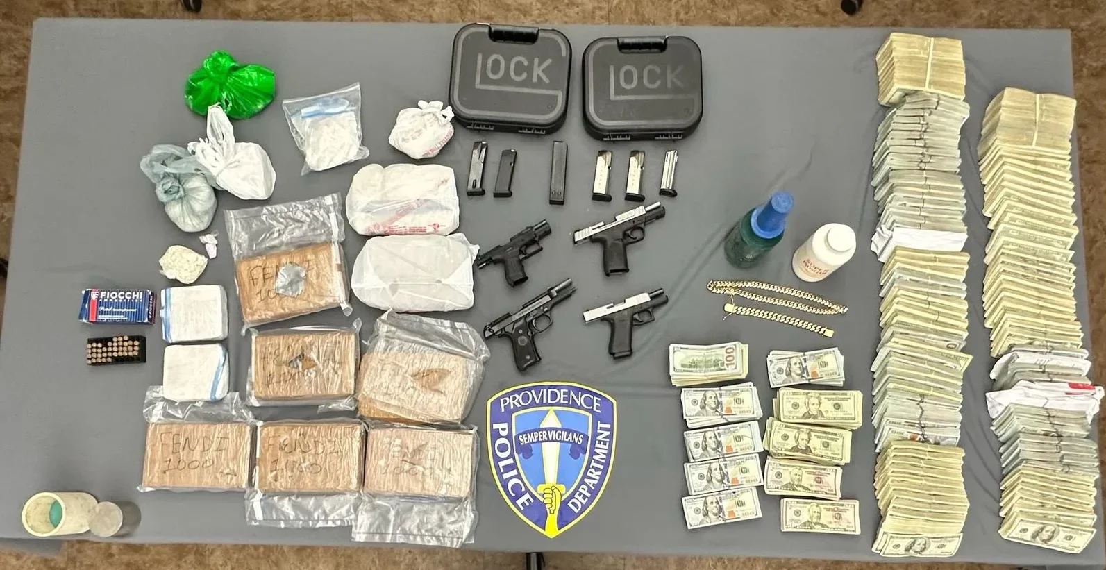 En una casa de la avenida Winthrop, la Policía dijo que encontró más de un millón de dólares, cuatro armas y 11 kilogramos de fentanilo, cocaína y heroína.