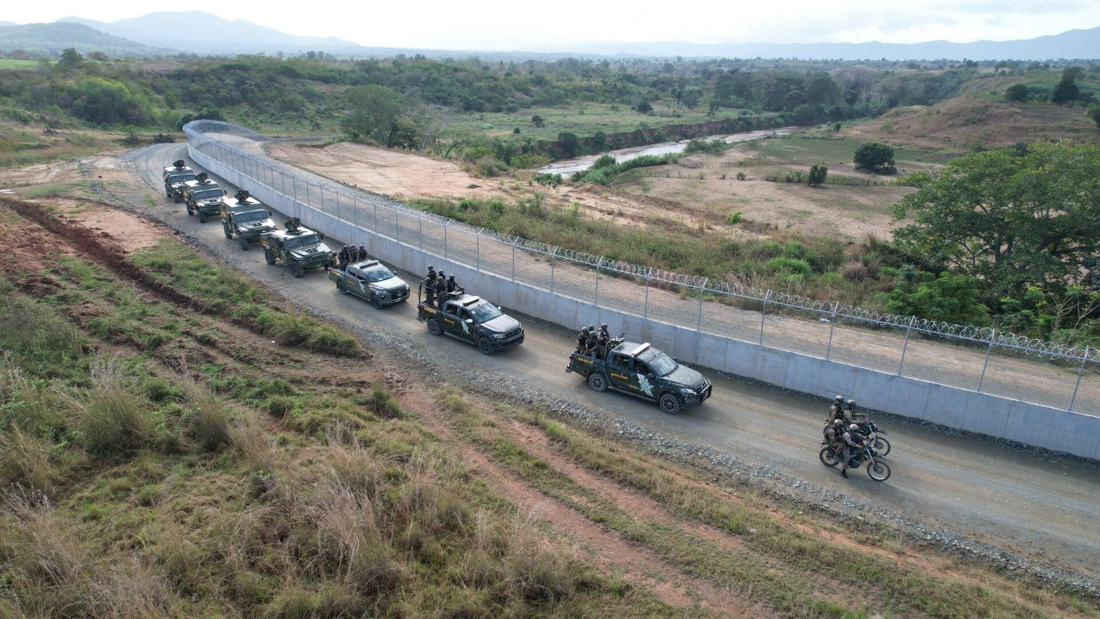 Un convoy militar recorre la zona del muro fronterizo, donde se observan desplegados en vehículos militares, además del uso de drones.