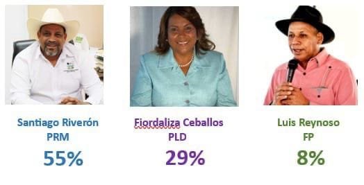 La pregunta: ¿DE ESTOS CANDIDATOS A ALCALDE, POR CUAL DE ELLOS USTED VOTARÌA? El 55% de los encuestados votaría por Santiago Riverón del PRM, un 29% votaría por Fiordaliza Ceballos del PLD y el 8% se decidiría por Luis Reynoso de Fuerza del Pueblo. Además, un 8% todavía permanece indeciso, es decir, no sabe por quién votaría.
