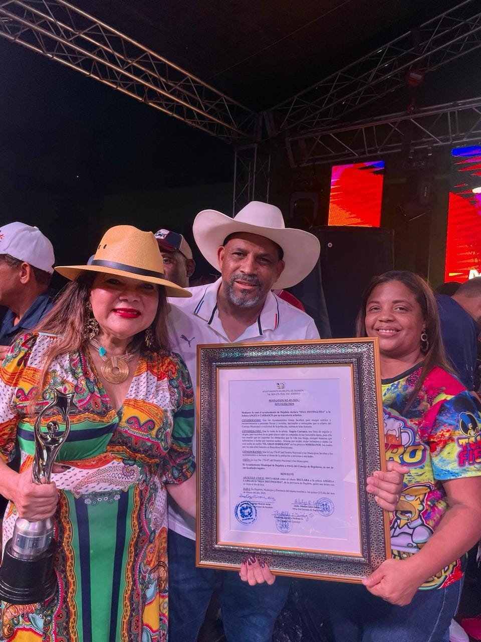 Dajabón.- La alcaldía Municipal a través de la sala capitular hizo entrega a la gran soberana Ángela Carrasco, de un reconocimiento como «hija Distinguida» cantante Dajabonera, la misma estuvo en el desfile del carnaval Dajabonero, organizado por UCADA, la misma fue recibida con algarabía, amor y respeto por los munícipes.