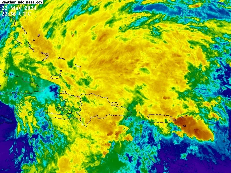 Un sistema de baja presión que se localiza al suroeste del país y la incidencia de una vaguada en los niveles medios y altos de la troposfera ubicada próximo a la porción oriental de Cuba, mantendrán las condiciones atmosféricas muy propicias para que presenten aguaceros siendo moderados a fuertes en ocasiones, tormentas eléctricas y ráfagas de viento, principalmente sobre la costa sur, la región suroeste y la Cordillera Central, como son: El Gran Santo Domingo, San Cristóbal, Peravia, San José de Ocoa, Azua, Barahona, Pedernales, Independencia y zonas cercanas.