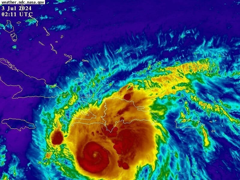 BERYL continúa como un huracán categoría 4. Se localiza en la latitud 16.6 norte y longitud 74.4 oeste, esto es, a unos 300 kilómetros al este/sureste de Kingston, Jamaica. Tiene vientos máximos sostenidos de 230 kph y se desplaza hacia el oeste/noroeste a unos 31 kph.