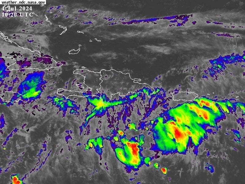 Hoy jueves; una vaguada en altura, así como, una activa onda tropical localizada al sureste de la isla asociada a una área de aguaceros con tormentas eléctricas y ráfagas de viento, la misma con bajo potencial ciclónico (10%) y moviéndose rápidamente hacia el oeste-noroeste.