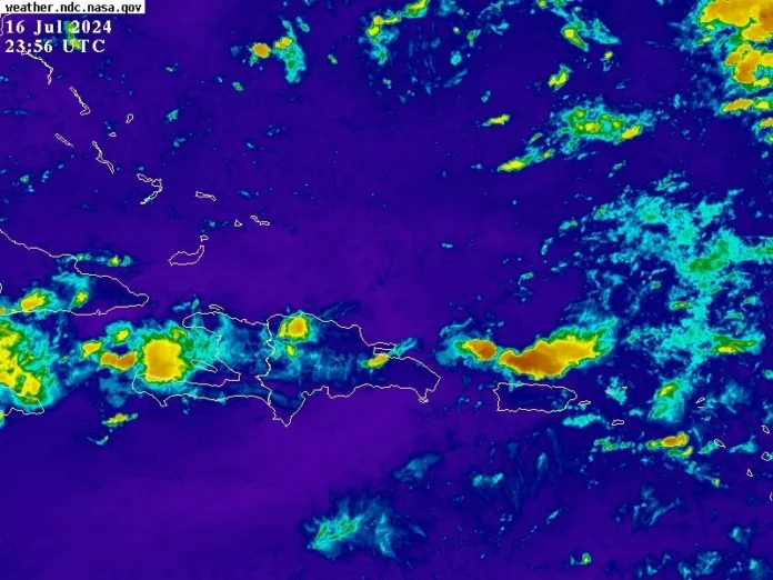 Hoy, los efectos de una onda tropical y la presencia de una vaguada en varios niveles de la troposfera estarán provocando algunos incrementos nubosos desde horas matutinas hasta entrada la noche, acompañados de aguaceros dispersos con tronadas aisladas y ráfagas de viento sobre provincias de la vertiente: norte, noreste, el litoral costero Caribeño, así como, la llanura oriental y la cordillera Central.