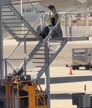 El video muestra a una empleada vestida con un chaleco de Cathay Pacific, arrojando negligentemente maletas por un tramo de escaleras desde un avión hasta la pista.