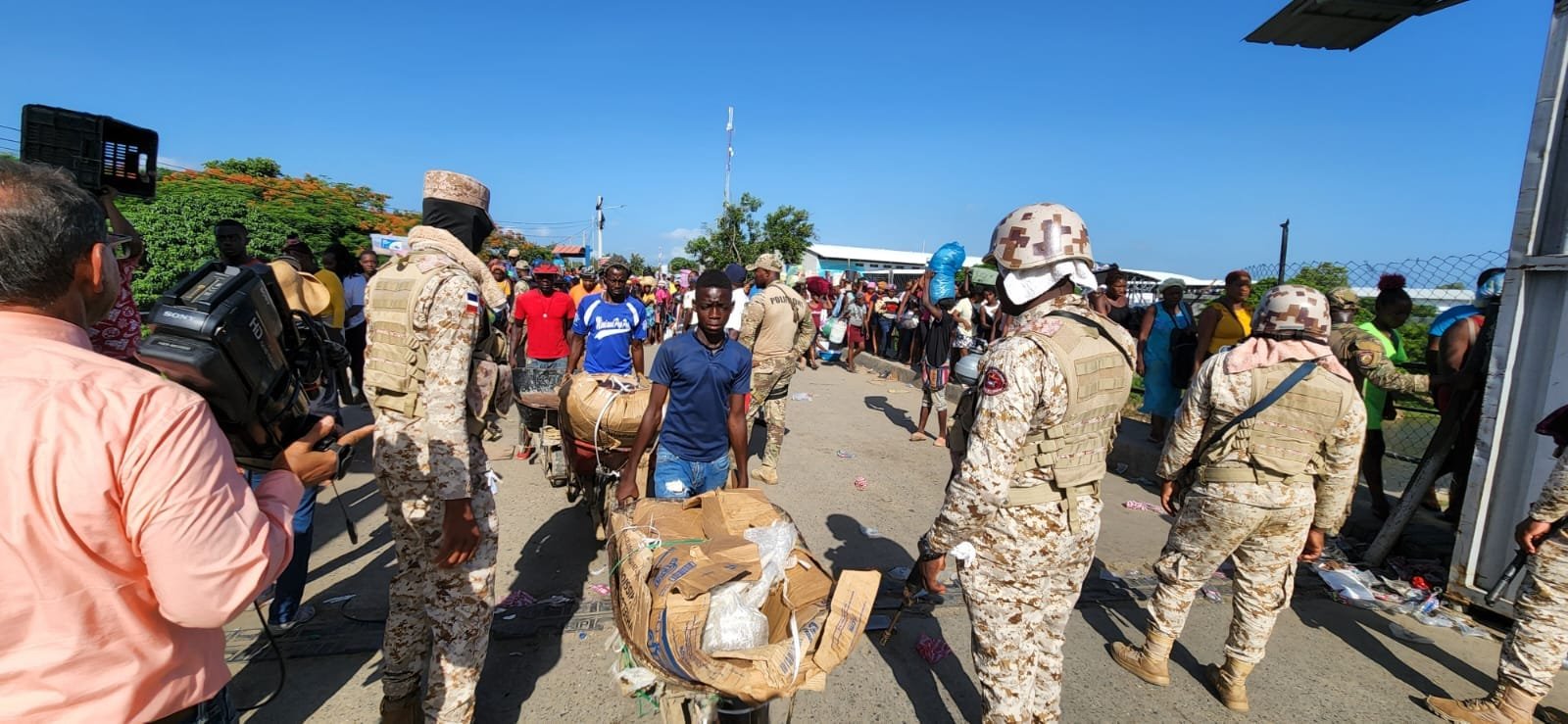 Los haitianos, divididos por género, son revisados por los miembros del Cuerpo de Seguridad Fronteriza (Cesfront), con el objetivo de que no sean introducidas al país carnes y alimentos cocinados desde Haití.