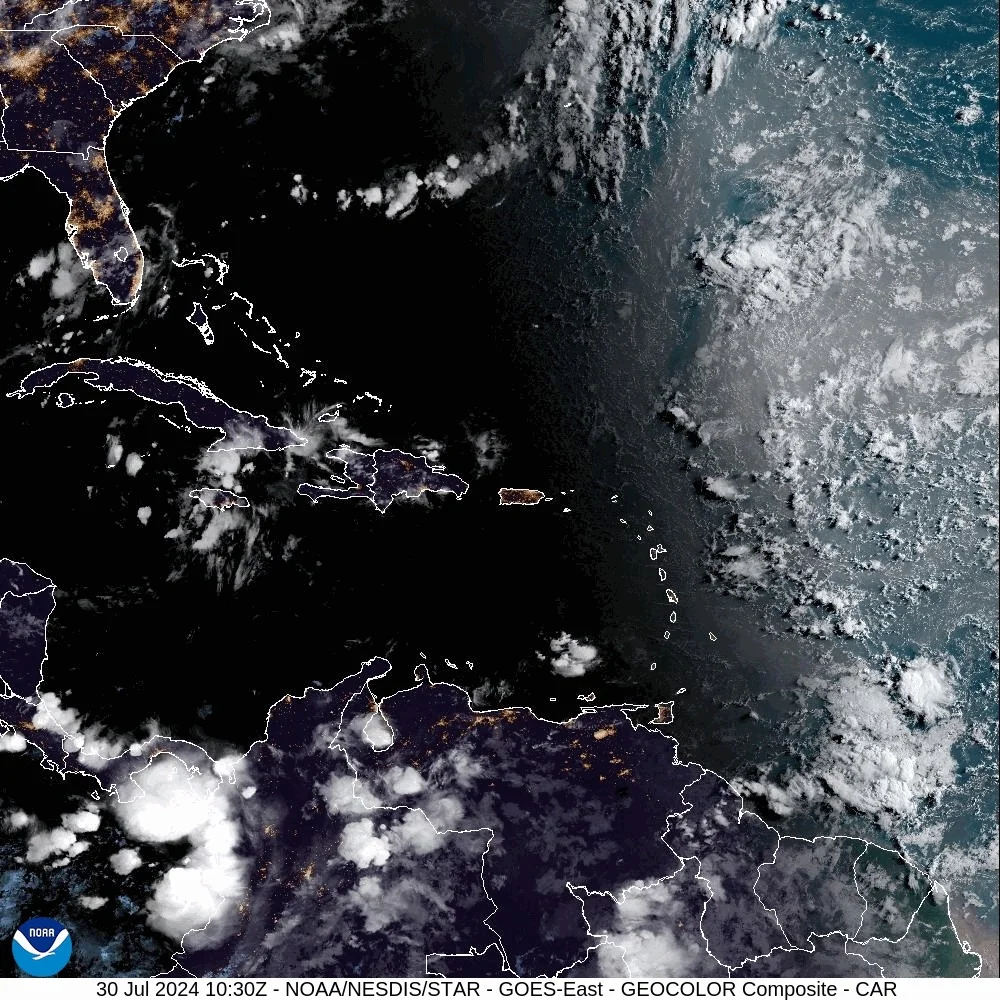 El INDOMET, informa sobre una amplia onda tropical a varios cientos de kilómetros de las Antillas Menores, está produciendo una zona de aguaceros  y tormentas eléctricas. Este sistema, presenta para las próximas 48 horas, una probabilidad de formación ciclónica muy baja, 0%, y en los próximos 7 días, de un 60 %.