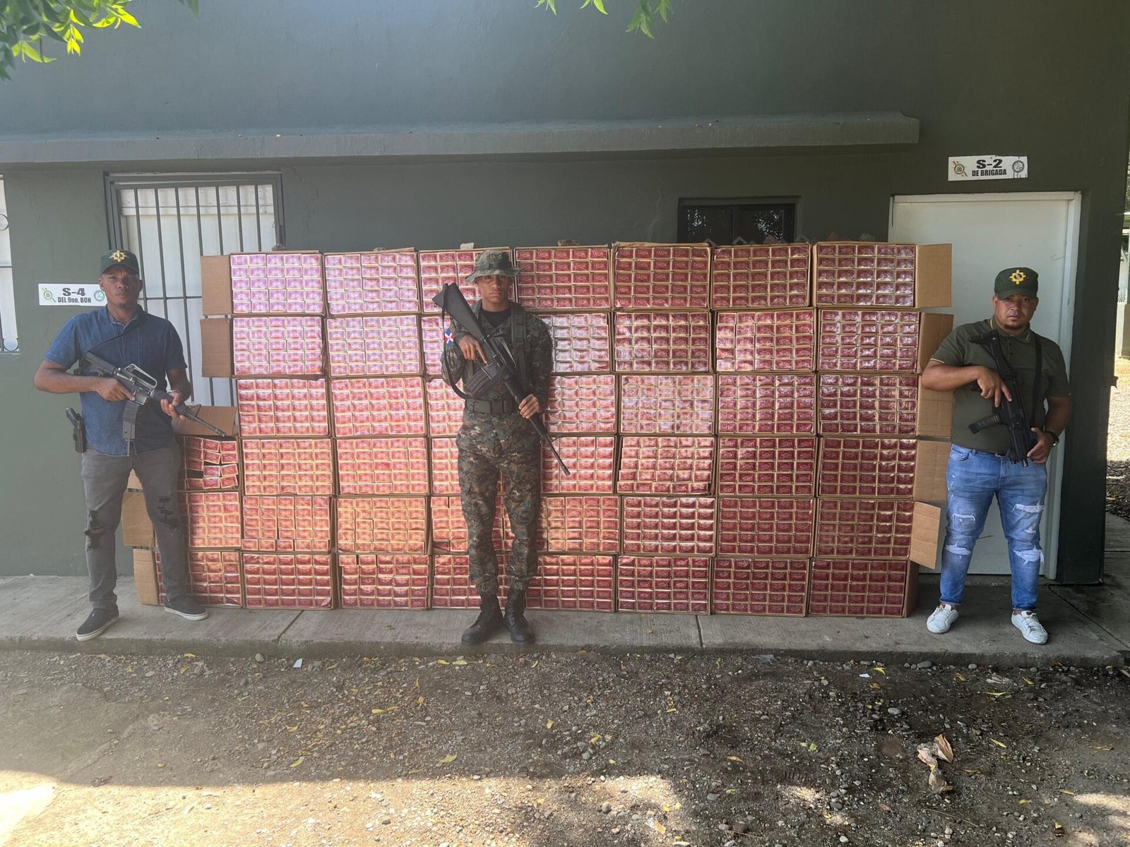 Miembros del Servicio de Inteligencia (S-2), asignados a la Cuarta Brigada de Infantería del Ejército Dominicano, tras una larga persecución, incautaron un cargamento de 450 mil unidades de cigarrillos, que estaban siendo transportados abordo de una Minivan de la marca GMC, de color blanco.