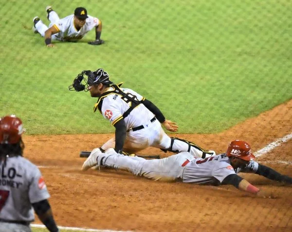 Los locales empataron en el séptimo cuando, con dos outs, Yadiel Hernández conectó indiscutible al central frente a Henry Sosa, Yefri Pérez entró a correr y se estafó la segunda para alcanzar el plato por incogible de Juan Lagares por tercera y error del antesalista Luis De los Santos.