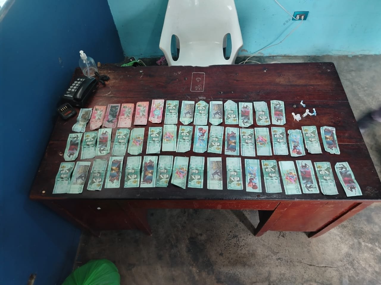 Al ser requisado, se le encontraron en el bolsillo izquierdo de su bermuda azul con blanco, cuatro (04) bolsas de un polvo blanco, que según sus características, se presume que es cocaína. Asimismo, en el bolsillo derecho llevaba la cantidad de $RD 28,000 pesos Dominicanos, en billetes falsos, discriminados en Cuarenta y dos (42) billetes de quinientos pesos ($RD 500), cinco billetes de mil pesos ($RD 1,000), y un billete de dos mil pesos ($RD 2,000).