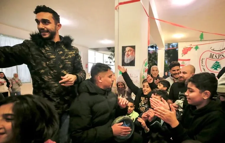 Desplazados libaneses celebran el anuncio de alto el fuego en una escuela local en la ciudad sureña de Sidón. EFE/EPA/STR