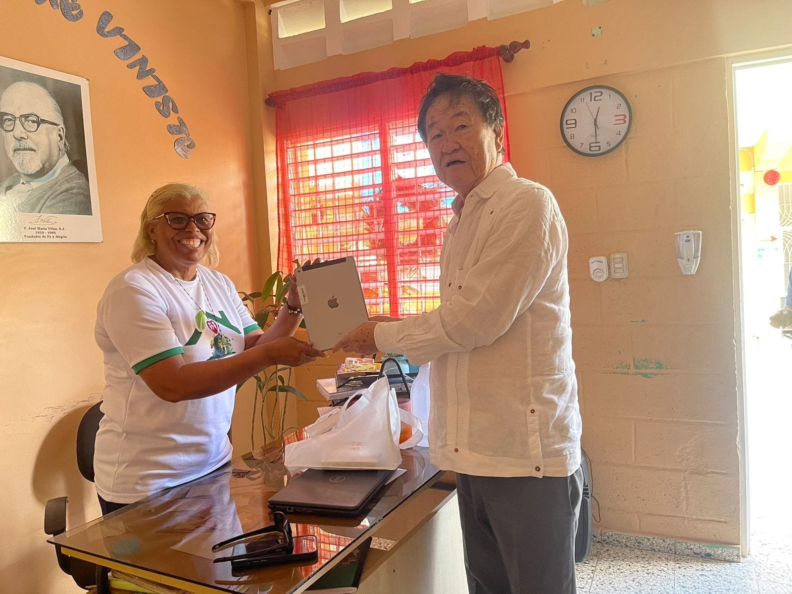 Dajabón.- El empresario Takeshi Mukai realiza entrega de diversas ayudas sociales, entre las que podemos destacar un cheque de 45 mil pesos para la celebración de la cena navideña del sector Mukai, una nevera a una señora de escasos recursos y la entrega de una Tablet Marca IPhone, para ser entregado a una de la participantes en el concurso de oratoria celebrado por el centro Fé y Alegría.