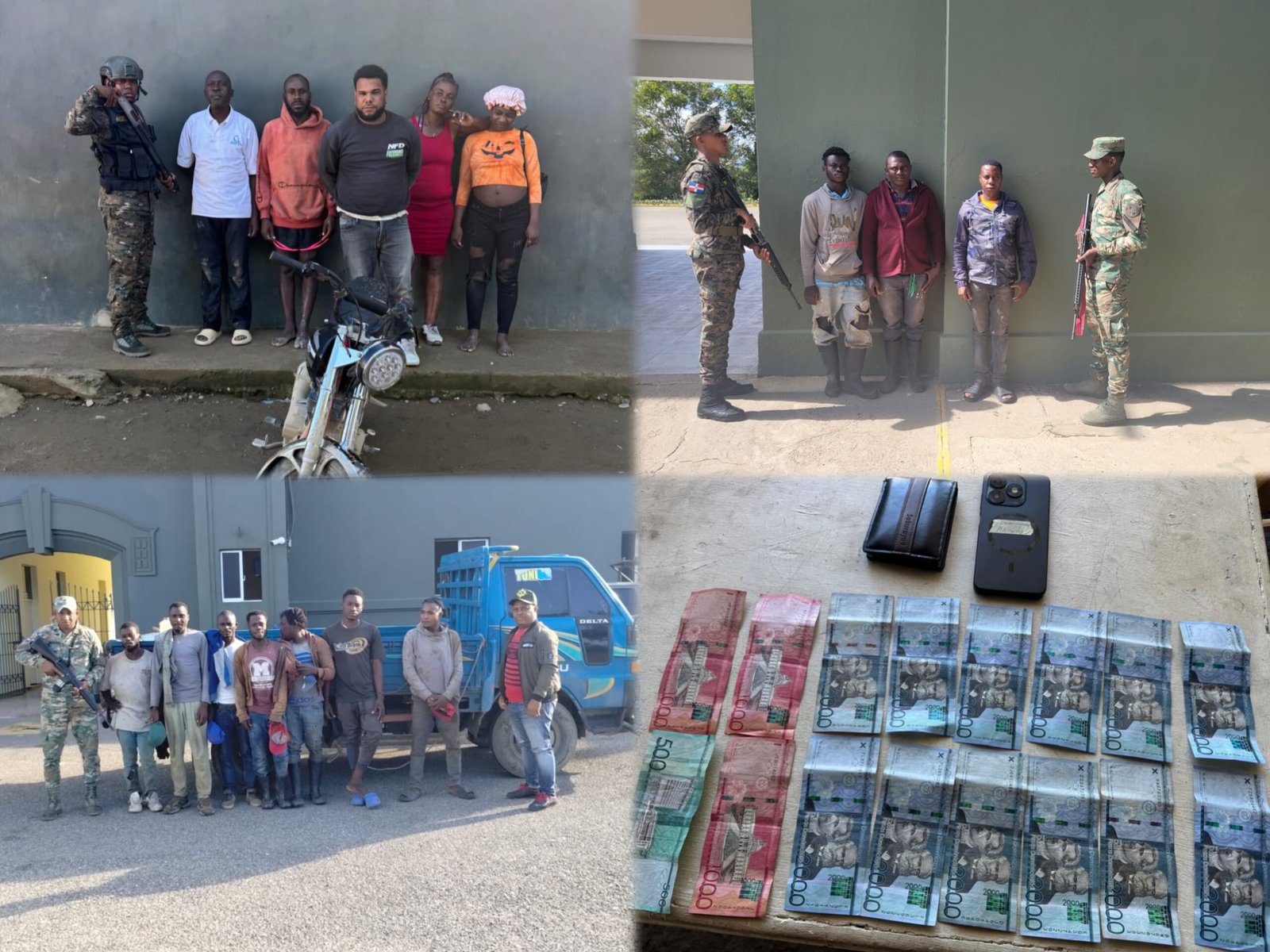 En las inmediaciones del cruce de Guayacanes, en Valverde , fue detenido Aneudy Grullón , quien fue interceptado por una patrulla del ERD mientras transitaba con cuatro (04) nacionales haitianos indocumentados, en una motocicleta marca Tauro, modelo CG-200, color negro, sin placa, en la cual al ser inspeccionada fueron encontrados veintisiete mil pesos (RD$27,500) .