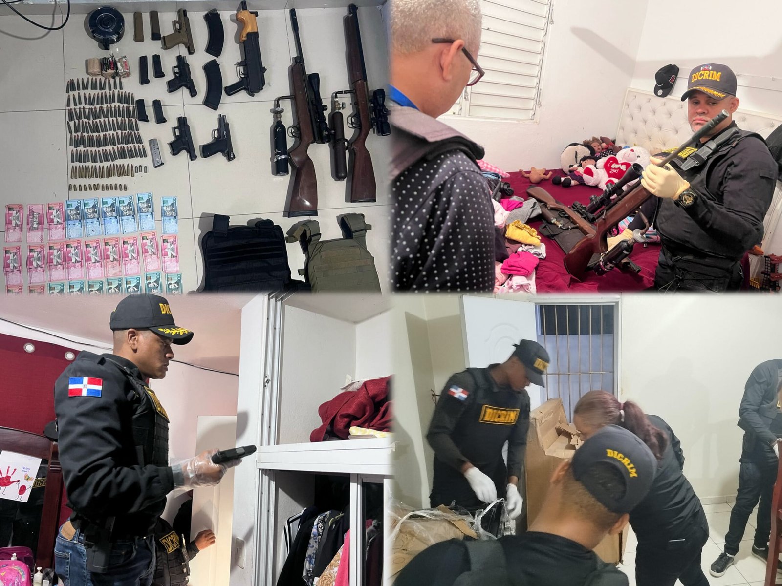 El arsenal de armas, algunas ilegales y otras con permisos vencidos, estaba compuesto de un fusil calibre 7.62 mm, una escopeta calibre 12, 5 pistolas calibre 9 milímetros, una pistola calibre .380, dos rifles de aire comprimido, 167 municiones calibre 7.62 mm, 18 municiones calibre 5.7 mm, 16 municiones calibre 9 mm, así como dos chalecos y 32,050.00 pesos en efectivo.