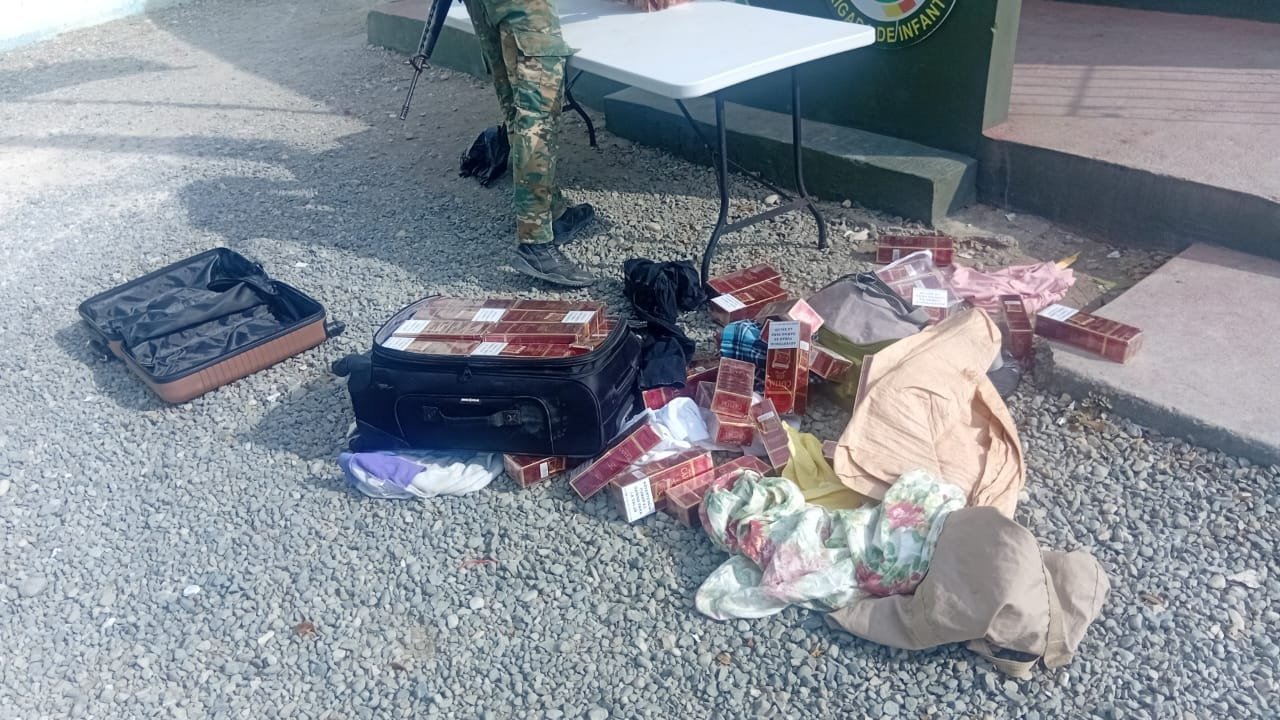 Azua.- Dos pasajeras de un autobús del transporte público fueron detenidas durante una inspección vehicular realizada por miembros del Ejército, en la cual fue encontrado un contrabando de 100 paquetes de cigarrillos en dos maletas.