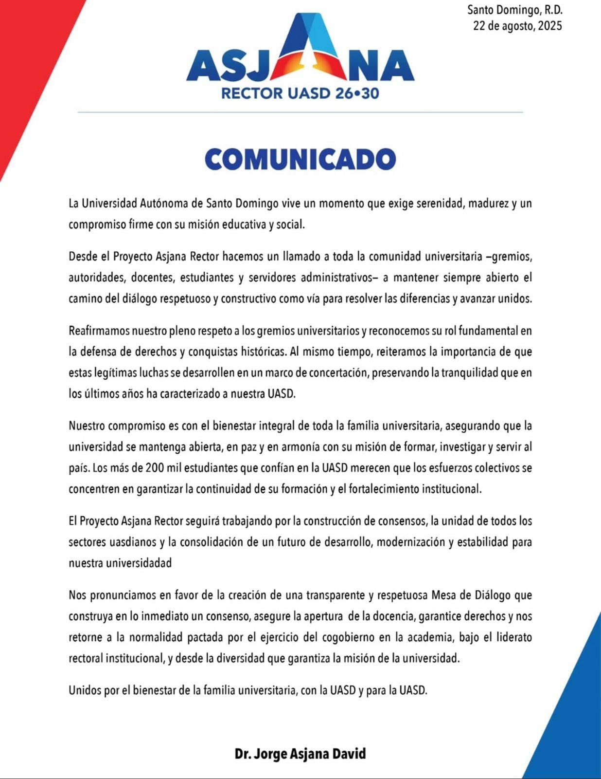 El Proyecto Asjana Rector seguirá trabajando por la construcción de consensos, la unidad de todos los sectores uasdianos y la consolidación de un futuro de desarrollo, modernización y estabilidad para nuestra universidad.