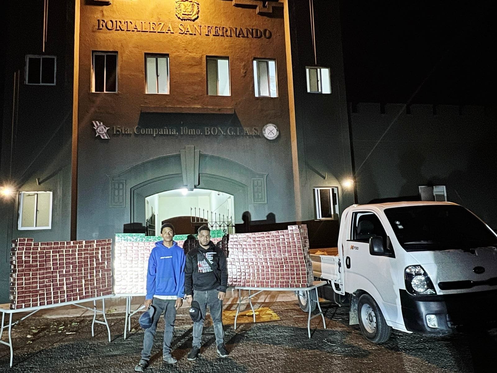 Durante el operativo fueron detenidos dos hombres y decomisado el cargamento de cigarrillos de procedencia extranjera, que fue descubierto en un camión marca Kia, color blanco, placa L434718.