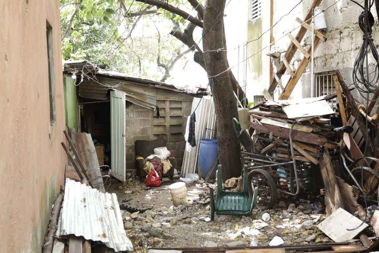 Ese patio es un corredor estrecho lleno de pedazos de zinc, madera podrida y restos de basura. Una silla plástica rota, una carretilla y varios recipientes vacíos completan el paisaje. Ahí, entre los escombros, se levantan las paredes que desataron el conflicto.