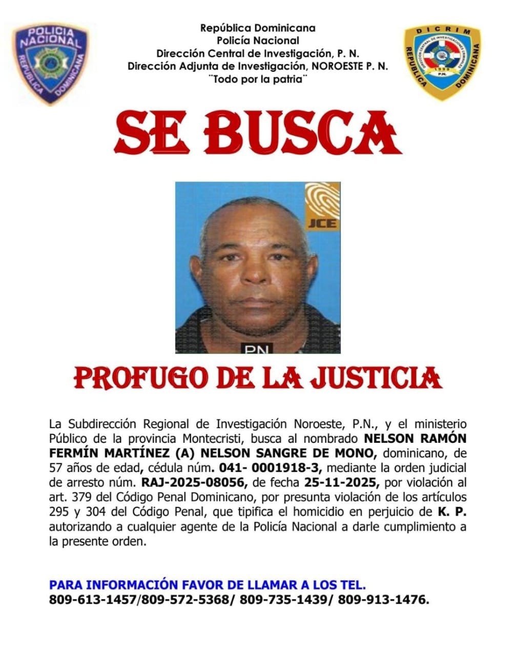 Mao, Valverde.– La Dirección Regional Noroeste de la Policía Nacional informó que mantienen activa la orden de arresto No. RAJ-2025-08056, de fecha 25 de noviembre de 2025, en contra del ciudadano identificado por el Ministerio Público de Montecristi como Nelson Ramón Fermín Martínez (a) “Nelson Sangre de Mono”, de 57 años de edad, según los datos ofrecidos por las autoridades.
