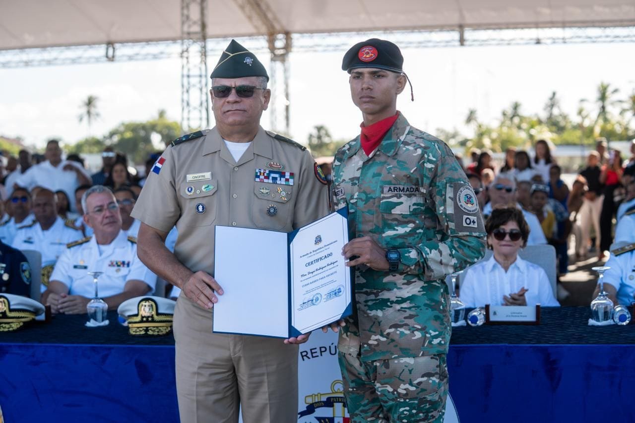 Acompañaron al ministro de Defensa la gobernadora provincial de Peravia, señora Ángela Yadira Báez, así como el vicealmirante Juan B. Crisóstomo Martínez, comandante general de la Armada, quien realizó la entrega del reconocimiento al graduado destacado de la promoción, en atención a su desempeño académico, dedicación, disciplina y vocación de servicio.