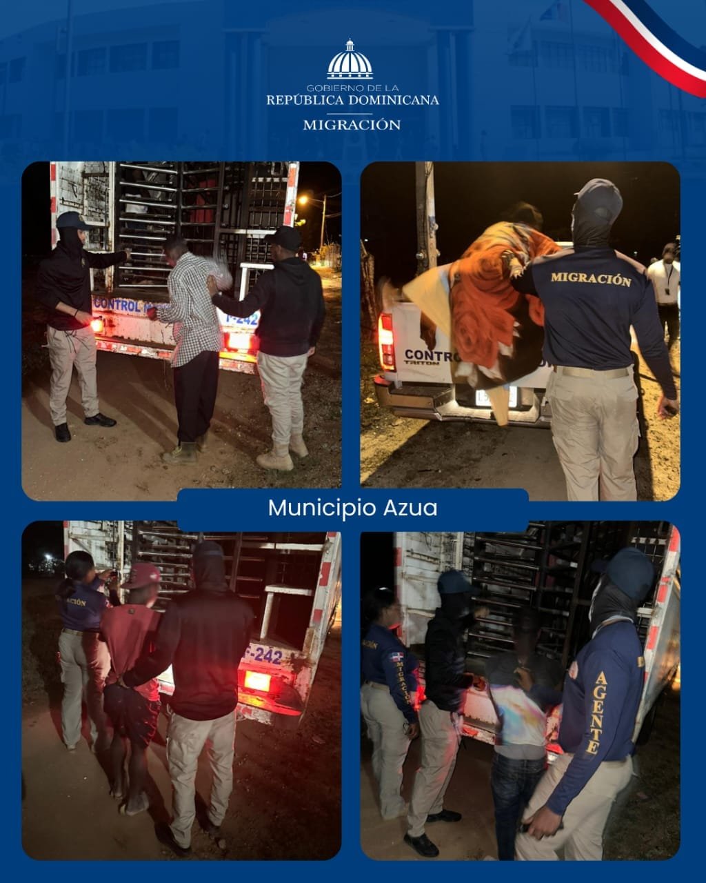 Mientras que en Azua, en estrecha colaboración con las instituciones militares, agentes de la DGM en Los Pilones detuvieron en el sector La Guanábana, a 14 personas en su mayoría inmigrantes de nacionalidad haitiana, quienes eran transportados en un vehículo blanco y cuyo conductor según arrojaron las investigaciones preliminares, es de nacionalidad dominicana. Entre ellos se encontraban tres mujeres y dos menores de edad.