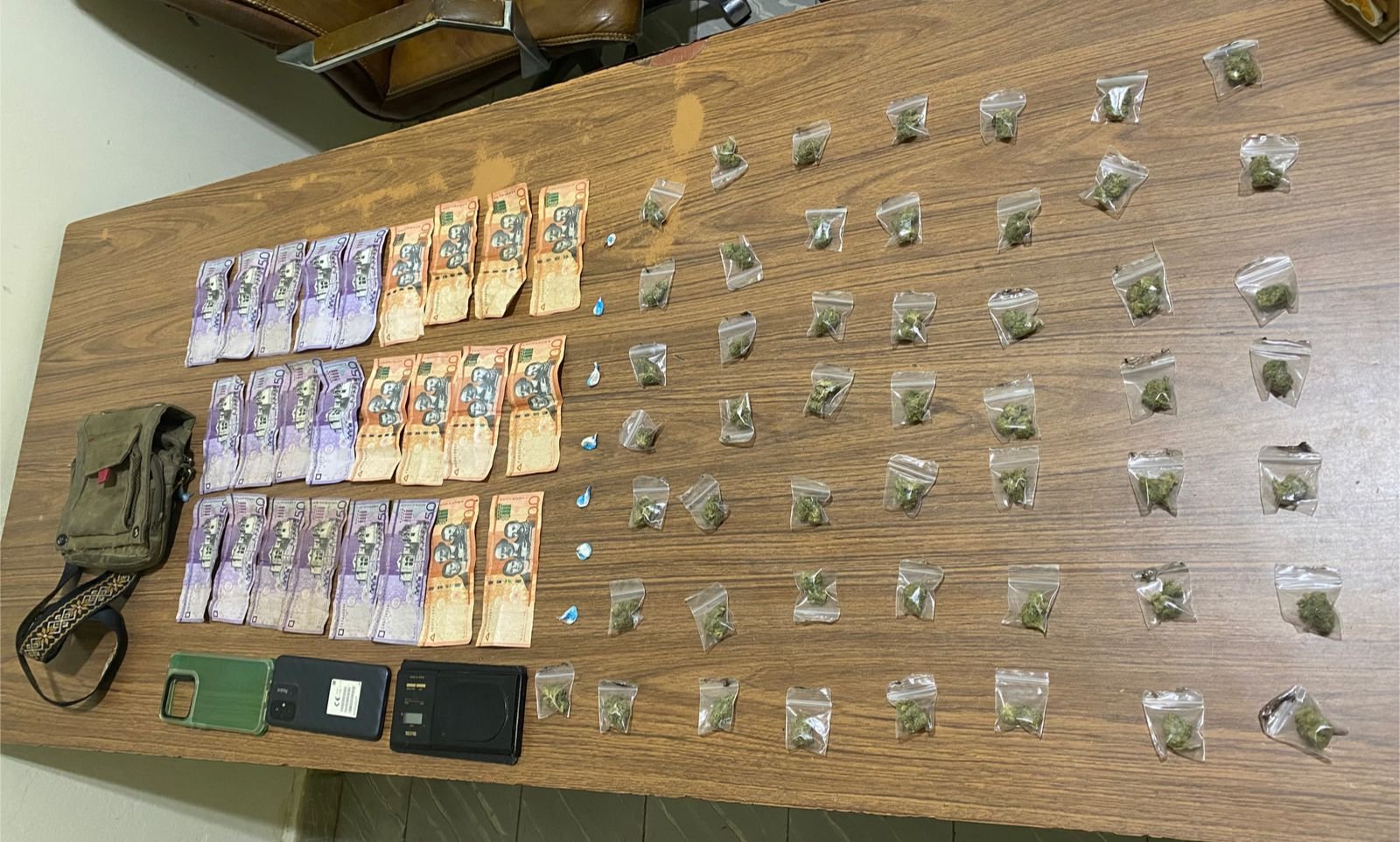 Al detenido se le ocupó un bulto que contenía 50 porciones de un vegetal, presumiblemente marihuana, con un peso aproximado de 54.89 gramos, así como siete porciones de un polvo blanco, presumiblemente cocaína, con un peso de 1.92 gramos. Además, se le incautaron RD$1,750.00 en efectivo, una balanza y un teléfono celular, evidencias asociadas a la presunta actividad ilícita.